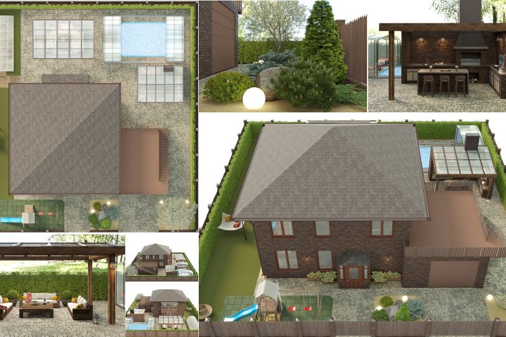 Проект ландшафтного дизайна площадью 600 кв.м. В соответствии с пожеланиями заказчика предусмотрены: срытый бассейн, мощение, цветники и рокарий, зеленое ограждение (туи), освещение, лежаки, детская площадка.