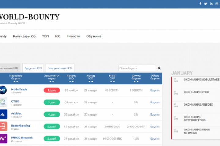 Для сайта по ICO криптовалют была создана таблица с выводом активных, будущих и прошедших ICO. В административной панели есть возможность добавления и редактирования новых ICO, есть возможность сортировки полей таблицы, поиска по таблице, таблица адаптивна.