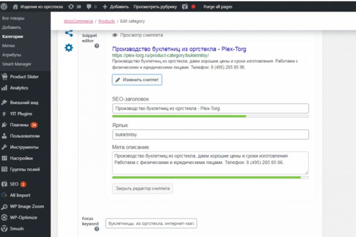 Заполнение мета-данных категорий сайта https://plex-torg.ru/ . Сайт на Wordpress.