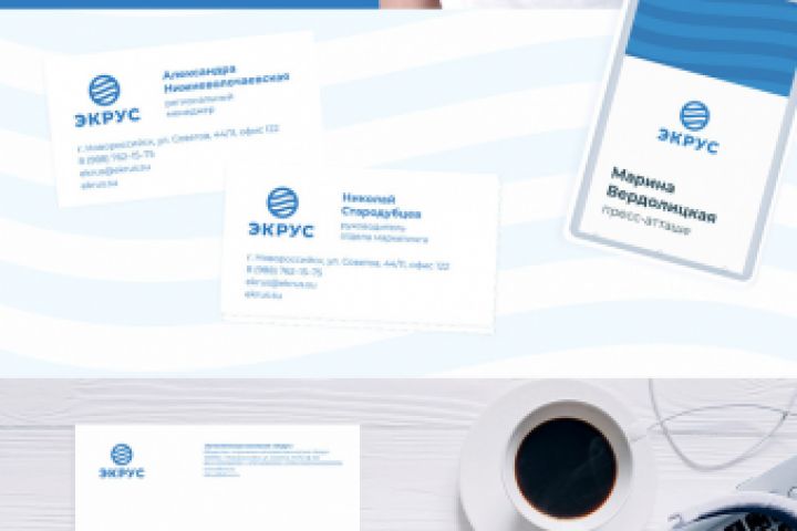 Для логистической компании «Экрус», в соответствии с пожеланиями клиента, был создан логотип и фирменный стиль, напоминающий о море.