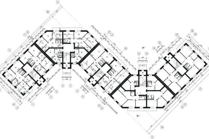 План первого этажа жилого дома средней этажности на 70 квартир. Дом состоит из поворотной, торцевой и рядовой секции.