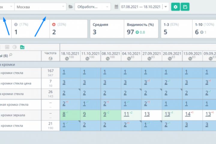 Позиции сайта одного из клиентов по кластеру (ключевым запросам) связанных с обработкой кромки стекла, по региону Яндекс - Москва.