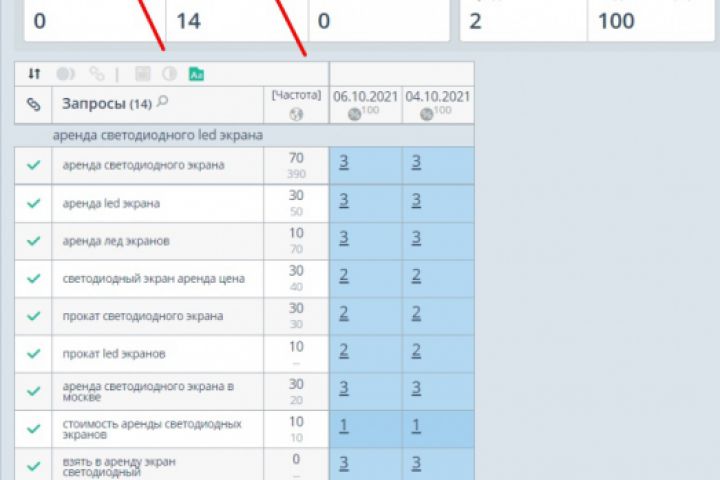 Позиции сайта одного из клиентов по кластеру (ключевым запросам) связанных с арендой светодиодных экранов, по региону Гугл - Москва