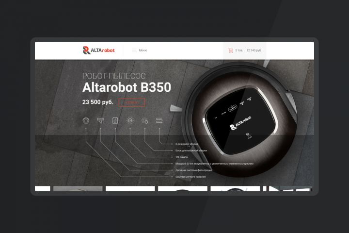 Дизайн небольшого интернет магазина роботов пылесосов. Всего 4 товара, для каждого из которых создан свой отдельный лендинг. Все лендинги объединены единым стилем, общей точкой входа и рядом общих страниц для оформления заказа.