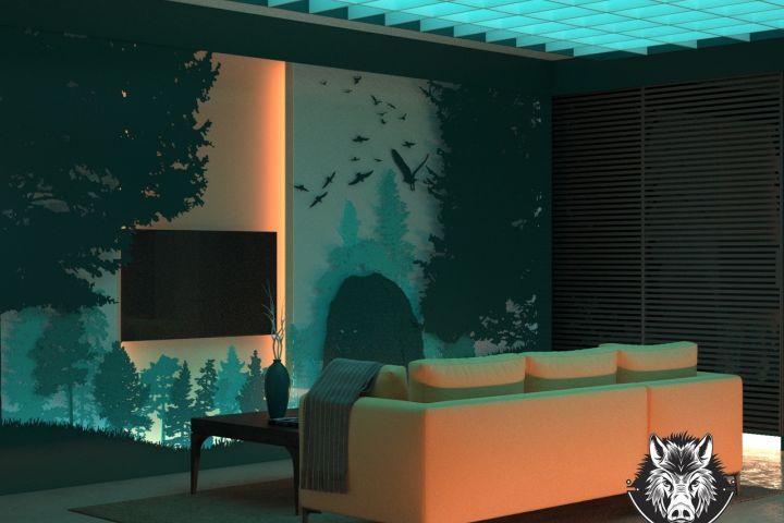3. Непосредственно перед диваном расположена гигантская многослойная панель на всю стену с пейзажем. Каждый слой имеет свою подсветку. Задняя стенка панели открывает доступ к телевизору. Панель перекрыта стеклом, чтобы внутрь не попадала пыль. При необходимости панель открывается, чтобы получить доступ, например, к элементам освещения или для каких-либо иных целей.