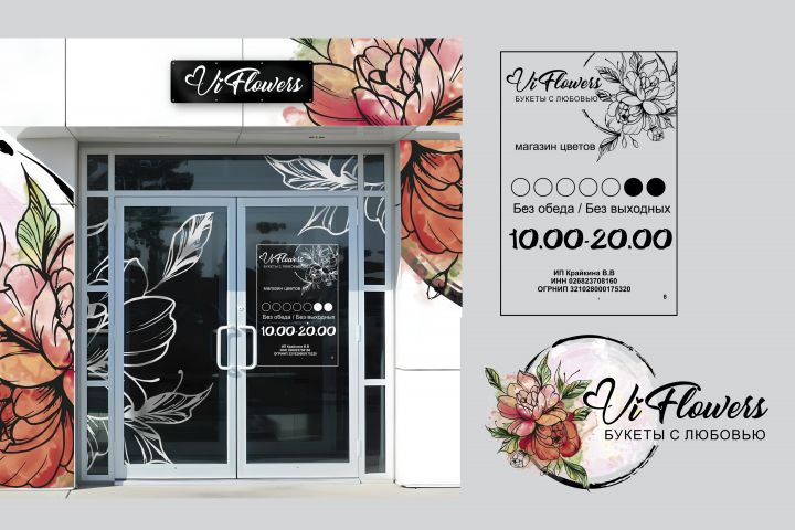 Фасадные стенды с широкоформатной полиграфией на виниле, кроме того на стеклянной двери орнамент выполнен в технике пескоструйного декорирования стекла.