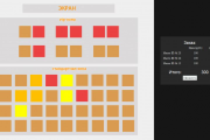 6. Визуальное отображение купленных, резервированных и свободных мест, с обновлением от 10 мс. Пользователю не нужно обновлять страницу, чтобы получить свежие данные. Все обновляется автоматически