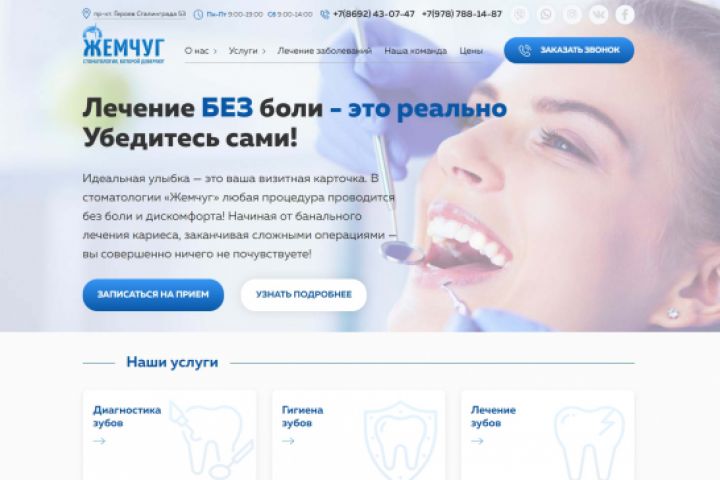 - Проведена первичная SEO оптимизация сайта. Зарегистрирован на основных стоматологических площадках для первичной ссылочной массы.