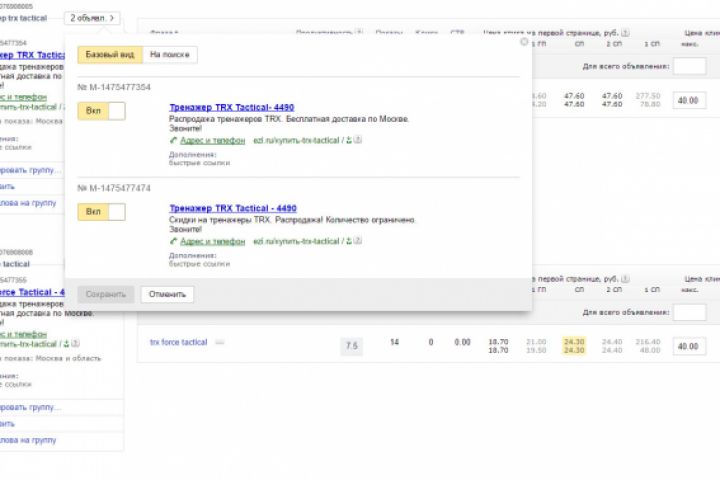 Составление продающих объявление, подбор эффективных ключевых слов c целью оптимизации бюджета; контекстная реклама+вывод позиций в ТОП3