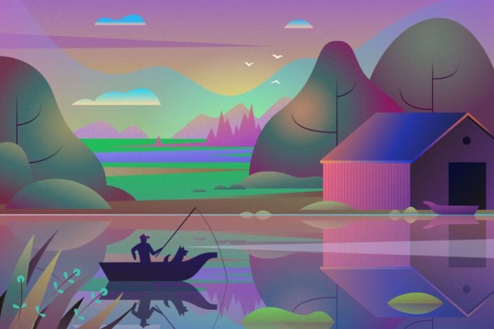 Рисунок отрисован по видео-уроку. Утренняя композиция в которой добавлен эффект шума и отражения в воде.