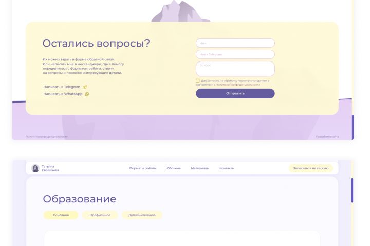 Я провела с Таней несколько интервью, проанализировала аудиторию и конкурентов, собрала прототип, помогла с написанием и редактурой текстов, придумала метафоры и визуальную концепцию, нарисовала дизайн, собрала в Тильде, настроила анимацию, сделала мобильную версию, подключила домен и настроила формы обратной связи.