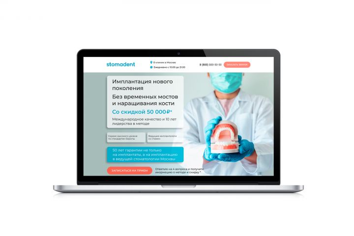 Концепт первого экрана лэндинга клиники протезирования.