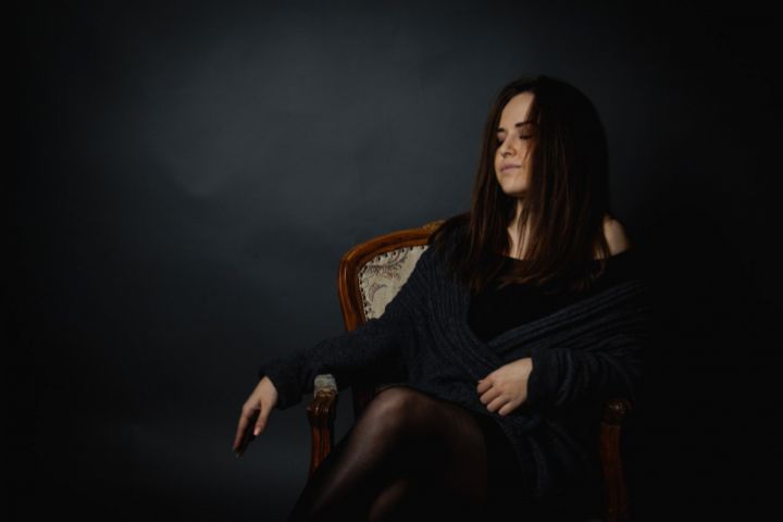 Фотография девушки в расслабленной позе на кресле в студии на черном фоне