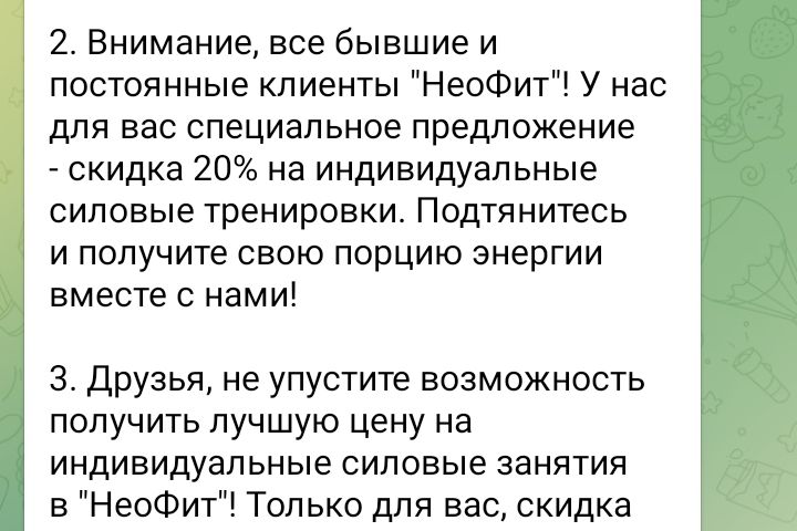 5 рекламных текстов, для смс рассылки, до 400 символов. Фитнес-центр "НеоФит". Приглашает на занятия по специальной цене своих бывших и постоянных клиентов! Только для вас, скидка 20% на индивидуальные занятия! Скидка распространяется только на силовые занятия.
