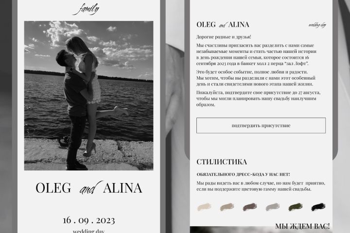 Сайт- свадебное приглашение, новый тренд. Это не только красиво, но еще и удобно, мы с легкостью можем добавить на сайт опросы, формы обратной связи- что облегчит вашу свадебную суматоху и сбор информации о присутствии гостей и их предпочтениях. Не нужно никого обзванивать, гости заполнят всю информацию на сайте и вы найдете ответы на свои вопросы просто зайдя на сайт. Точная стоимость и сроки работ озвучиваются после заполнения брифа.