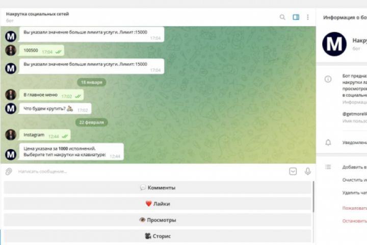Бот предназначен для накрутки лайков, просмотров, комментариев в социальных сетях.