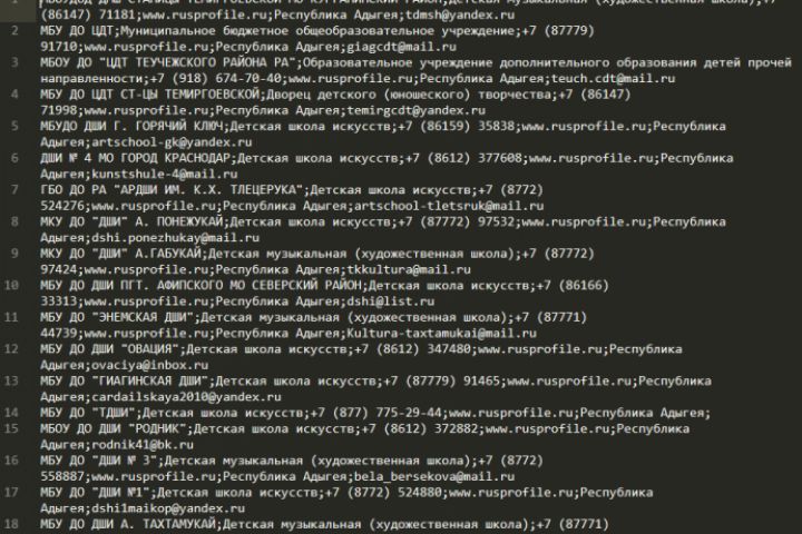 Парсер собирает данные музыкальных школ из справочника в файл, удобный для экспорта в Excel. В случае, если в справочнике нет электронной почты, но есть сайт, производится дополнительная попытка поиска почты на сайте.