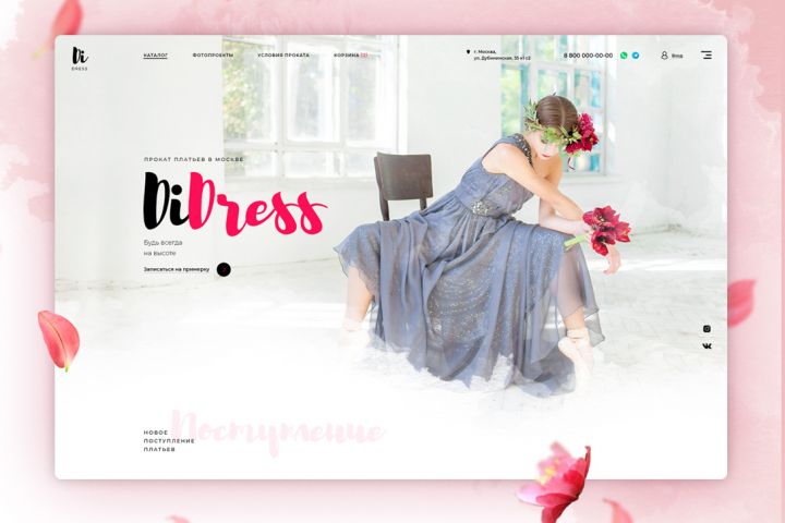 Стояла задача создать удобный и визуально привлекательный интернет-магазин для сервиса аренды платьев, где пользователи могут легко подобрать наряд, ознакомиться с условиями проката и оформить заказ. Ключевая задача — разработать интуитивный интерфейс, который упростит процесс выбора и бронирования, а также передаст ощущение премиальности и стиля.