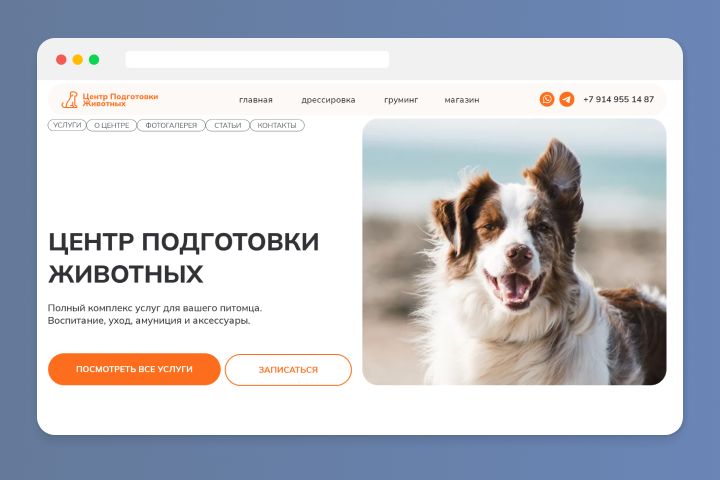 Задача: создать многостраничный сайт, который должен объединять несколько направлений: дрессировку собак, груминг-салон и интернет-магазин товаров для животных.