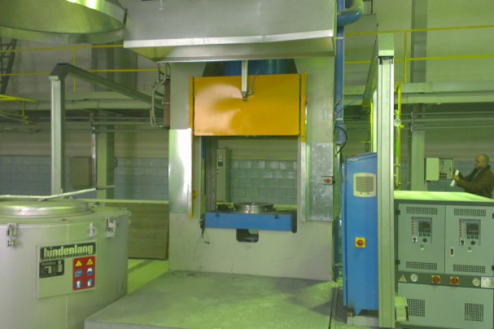 Линии полной автоматизации. Робот смазывает пресформу и достает заготовку. Второй робот заливает жидкий металл в пресформу.