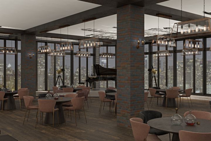 Разработка дизайна интерьера Джаз бара. Разработка концепции уютного заведения с акцентом на подсвеченном потолке с изображением пейзажа города.