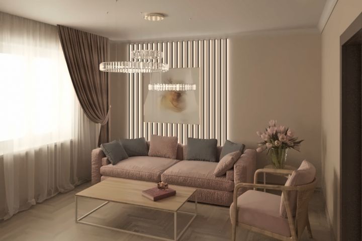Дизайн-проект гостинной в стиле минимализм. Главными пожеланиями выступали отсутствие марких поверхностей и возможность скрыть вход в зону гардероба