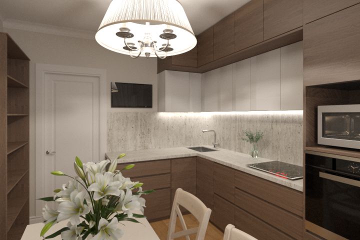 Дизайн-проект кухни 9 кв м, с учетом всех пожеланий заказчика в сдержанной цветовой гамме.