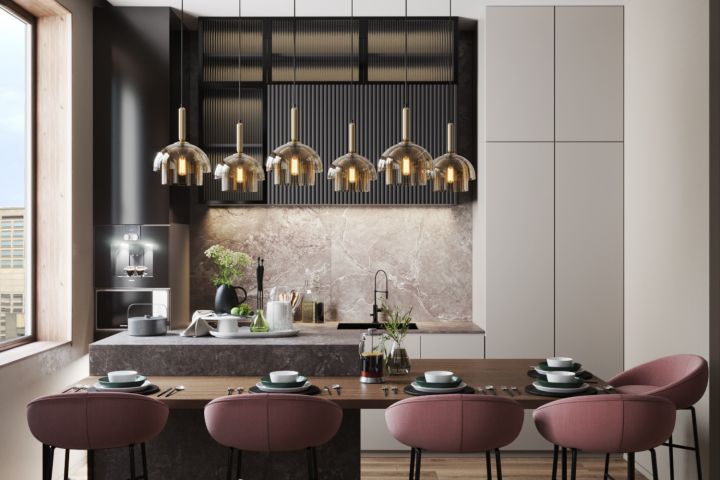 Заказчики - семьи из 5 человек, которая часто принимает гостей, хотели разместить в этой зоне и полноразмерный функциональный остров и комфортный обеденный стол. Я совместила обе эти фунции в таком оригинальном исполнении. Это решение позволяет использовать полубарные стулья вместо барных для большего комфорта, а также продолжает тему ассиметрии и цветового контраста кухонного гарнитура, создавая сбалансированную компазицию