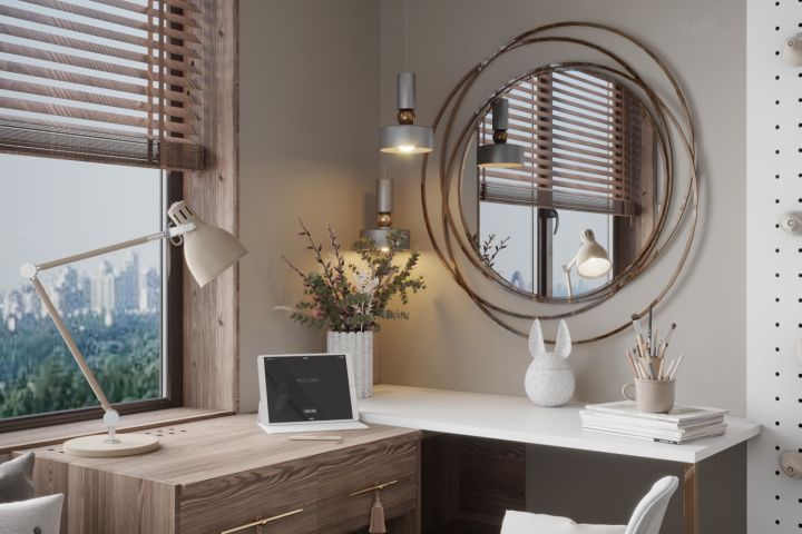 Так же предусмотрено искусственное функциональное освещение в дополнение к основному - настольная лампа с белым светом на рабочий стол. Подвесы с теплым светом - для нанесения вечернего мейкапа и подсветка зеркала холодного спектра - для нанесения дневного мейкапа