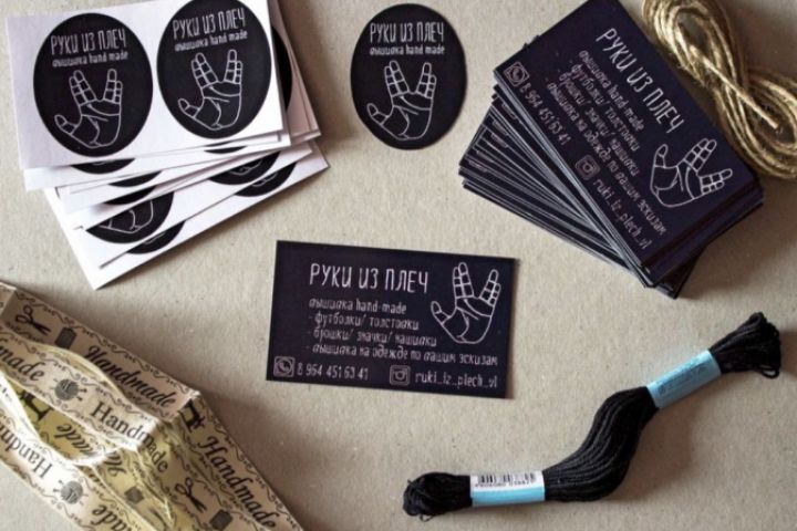 На основе лого и фирменного цвета (черный) сделала визитки и наклейки.