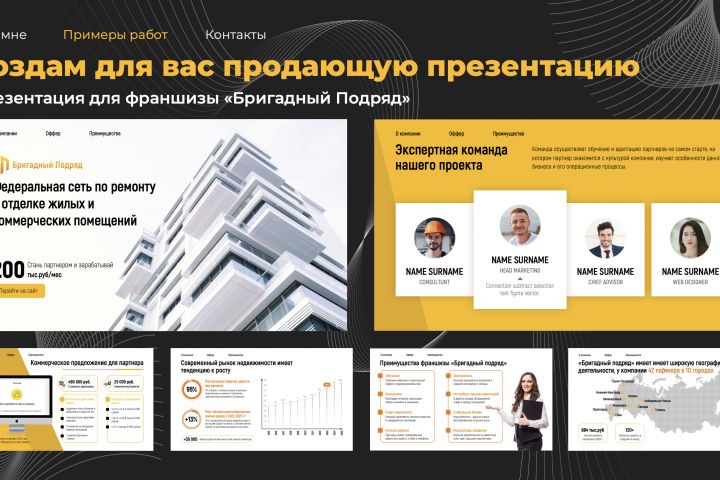 В данном кейсе представлено создание продающей презентации для франшизы "Бригадный подряд", которая сделана в корпоративном и строгом стиле в рамках учебной и профессиональной деятельности