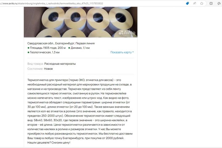 Текст: Термоэтикетка для принтера (термо ЭКО, этикетка для весов) – это необходимый расходный материал для маркировки продукции на складе, в магазине и на производстве. Термочек представляет из себя ленту самоклеящихся термо этикеток, смотанную в рулон. На термонаклейке можно напечатать текст, изображение или штрих-код. Как видно на фото, термоэтикетка обладает следующими параметрами: ширина этикетки (от 30 до 100 мм), длина этикетки (от 20 до 100 мм). Также важным значением является кол-во этикеток в ролике (это значение, как правило, находится в пределах 250-2000 штук). Обозначение термоэтикеток имеет следующий вид: 58х40, 58х60, 30х20, где первое значение – это ширина наклейки, а второе – её длина. Цена термоэтикетки различается в зависимости от количества наклеек в ролике и размеров этикетки. У нас Вы можете приобрести любую разновидность термоэтикеток. Мы бесплатно доставим Ваш товар в любую точку Екатеринбурга, при покупке от 2000 рублей. Нашли дешевле? Снизим цену!