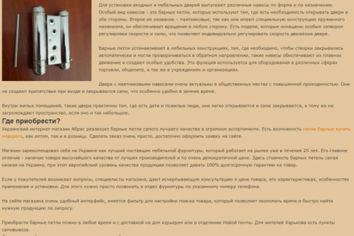 Характеристика специальных дверных навесов - барных или маятниковых петель, которые позволяют открывать двери в любую сторону. Возможности их приобретения на Украине.