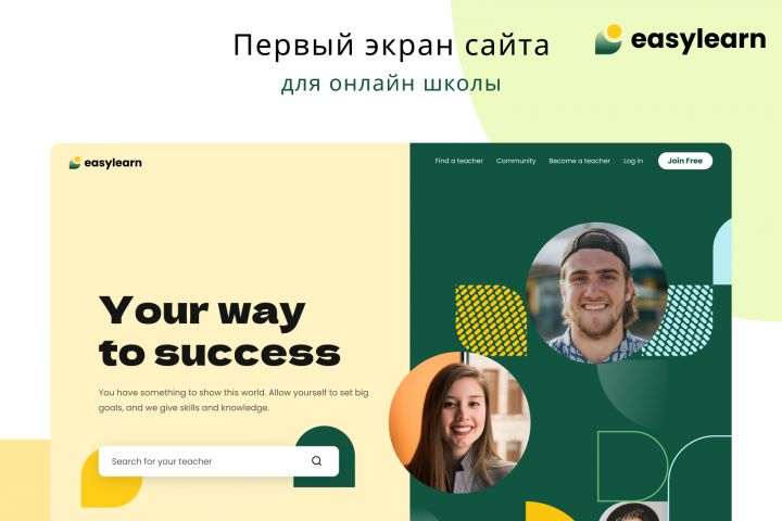 Основная функция страницы – строка поиска для поиска преподавателя по разным направлениям. Дизайн выполнен в спокойных тонах и вызывает доверие. Каждая новая запись на странице генерирует разные комбинации фотографий учителей. Пользователь может связаться с преподавателем и пообщаться в сообществе после небольшой регистрации или просмотреть сообщество и преподавателей без регистрации.