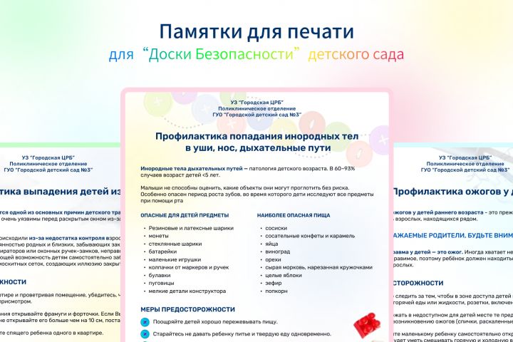 Я разработала серию памяток для печати для одного из детских садов Минска по теме безопасности. Памятки содержат полезную информацию и советы для родителей и выполнены в дружелюбном, детском стиле.