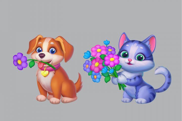 Кот с цветком и собачка с цветком