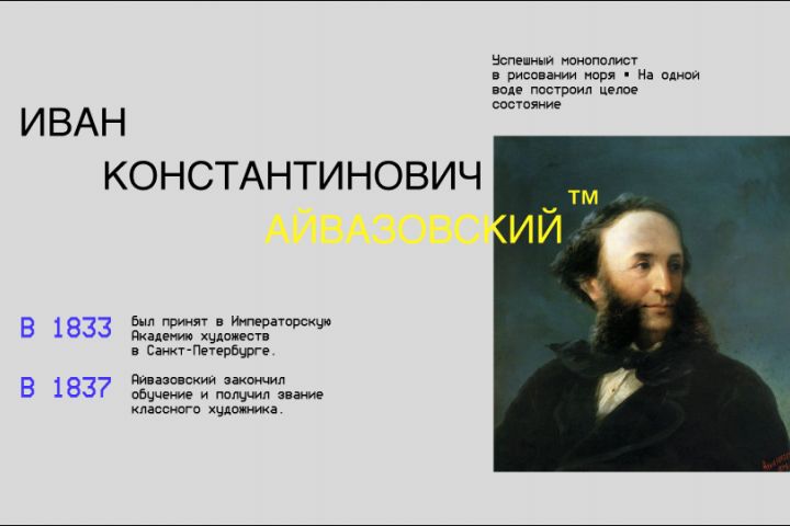 Кроме того, что Иван Константинович был художником, мне захотелось представить, что к тому же он и предприниматель, который нацелен продавать свои шедевры