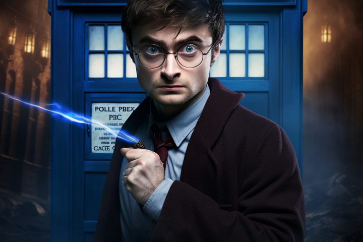 Daniel Radcliffe as a Harry Potter if he were Doctor Who with a Doctor Who's stick in his hand and blue police box behind him