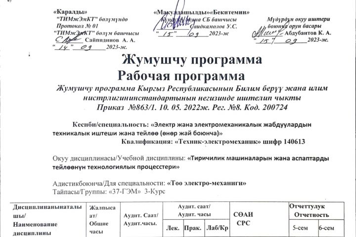 “ТИМжЭмКТ” бөлүм башчысы “_____”___________2023-ж __________ Абдубаитов К. А.