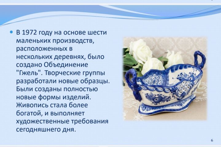 In 1972 six little manufactures in several villages were united into the Gzhel Association. The groups of pottery masters began working on new ceramic models and, finally, created an entirely new design representing a magnificent craftsmanship. Moreover, it remains superior nowadays.
