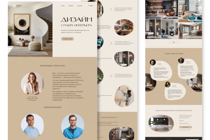 Идеей визуального оформления сайта было сделать акцент на кофейно-бежевых тонах, элементах, имеющих преимущественно круглую форму. Благодаря этому пользователю комфортно находится на сайте. Он не перегружен большим количеством текста, привлекательные изображения разбавляют спокойный дизайн. Структура сайта состоит из 7 блоков: главный экран, описание компании, услуги, преимущества, проекты, отзывы заказчиков, форма для заявки. Пользователь сперва изучает компанию и ее услуги, затем ознакамливается с готовыми проектами студии, читает отзывы заказчиков и переходит к оформлению