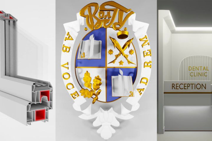 Различные работы разного типа сложности и смысла. Оконная рама в разрезе, герб колледжа, ресепшен.