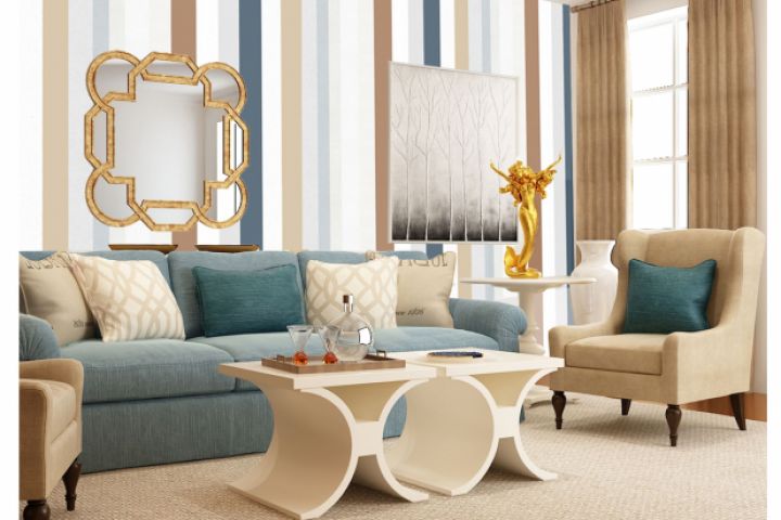 В интерьере преобладают пастельные тона: Бежевый, светло-коричневый, светло-голубой. Яркая статуэтка акцентно оживляет обстановку. Комната с естественным светом благодаря витражным оконным блокам в пол.