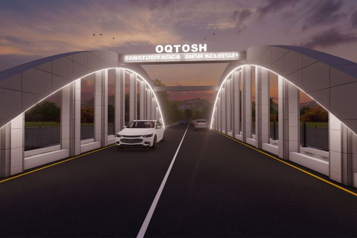 Вариант оформления арки моста через реку при въезде на территорию санатория.