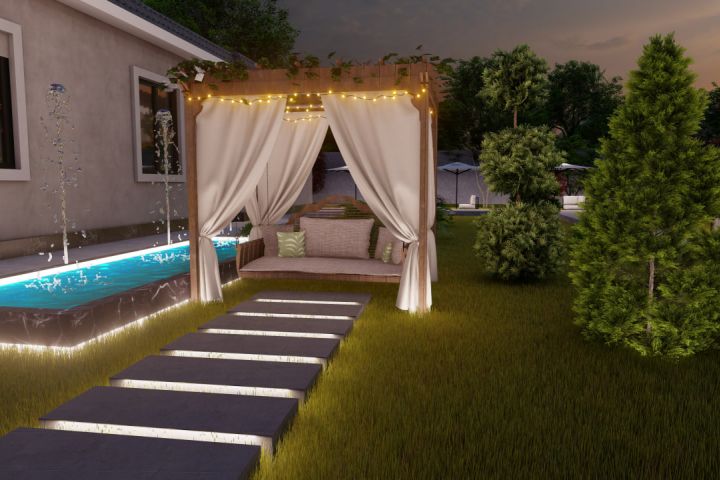Ландшафтный дизайн открытого ресторана в горах