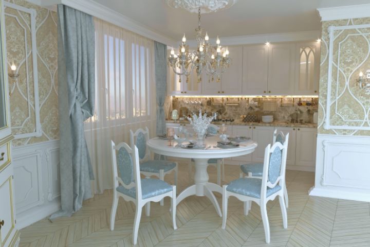 Дизайн интерьера кухни-столовой в классическом стиле, 34 м.кв.