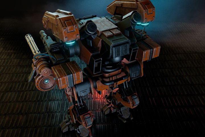 Mech создан по пайплайну Low poly + high poly + bake в Blender, Substance Painter и Photoshop