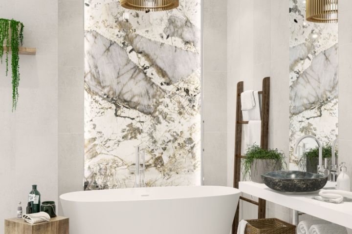 Визуализация интерьера ванной для представления коллекции керамической плитки и декоративной панели