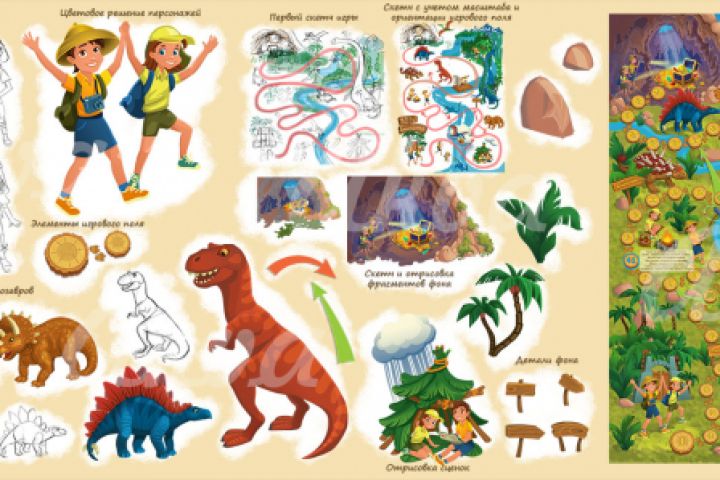 Этапы разработки настольной игры - ходилки, включая первые скетчи игрового поля, разработку персонажей, дизайн игровых элементов.