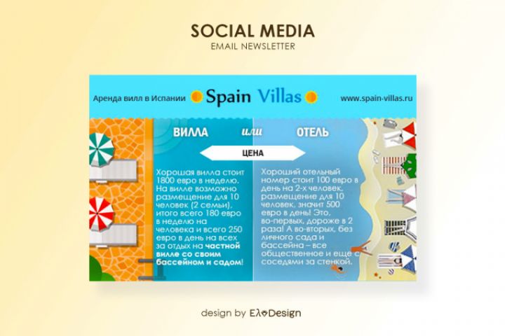 Заказ на создание письма рассылки на почту, вконтакте, инстраграм. Задачей было поставлено: сделать акценты на достоинствах отдыха на вилле. Дизайн выполнен в современном стиле (шрифт, иконки, графика)